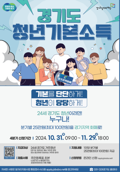 경기도 청년기본소득은 만 24세부터 29세까지의 청년에게 매 분기마다 25만 원씩, 연 100만 원을 지급하는 복지 제도입니다.